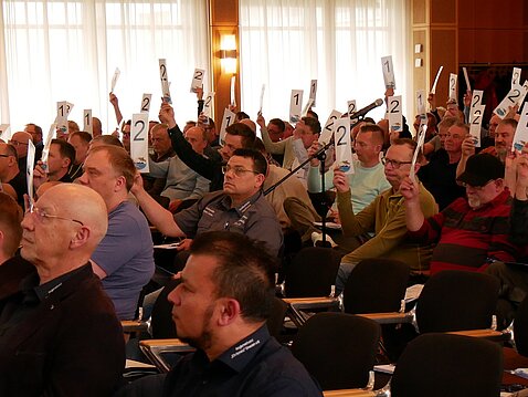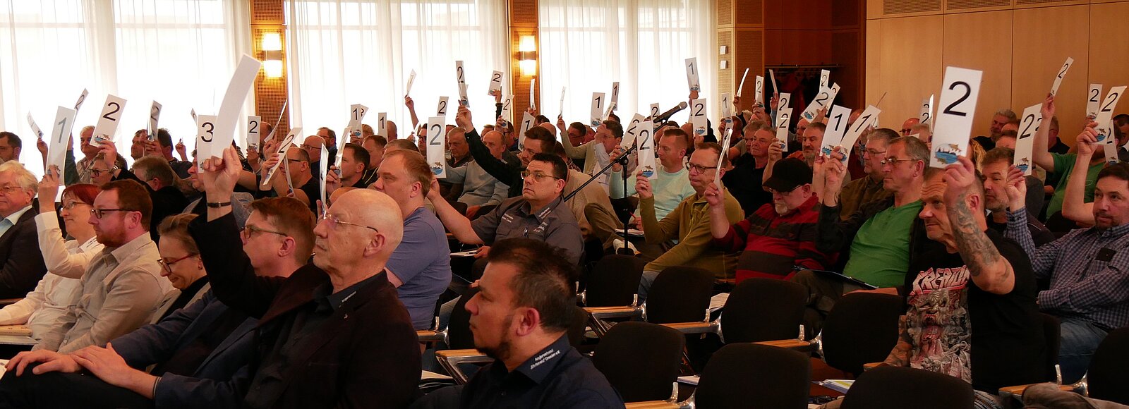 Die Beschlussfassungen über die Entlastung des Präsidiums und die Haushaltsabrechnung 2025 erfolgten einstimmig. Der Beschluss über den vorgelegten Haushaltsplan 2026 erfolgten mit deutlicher Mehrheit mit 226 Ja-Stimmen, 2 Gegenstimmen und 2 Stimmenenthaltungen. Auch die Delegierten des AVE, welche uns in der Landesverbandsdelegiertenversammlung vertreten, erfolgte einstimmig. Grundlegender Beschluss und von allen vorher mit Spannung erwartet war der Beschluss über die geplante Beitragserhöhung für die kommende Jahre.